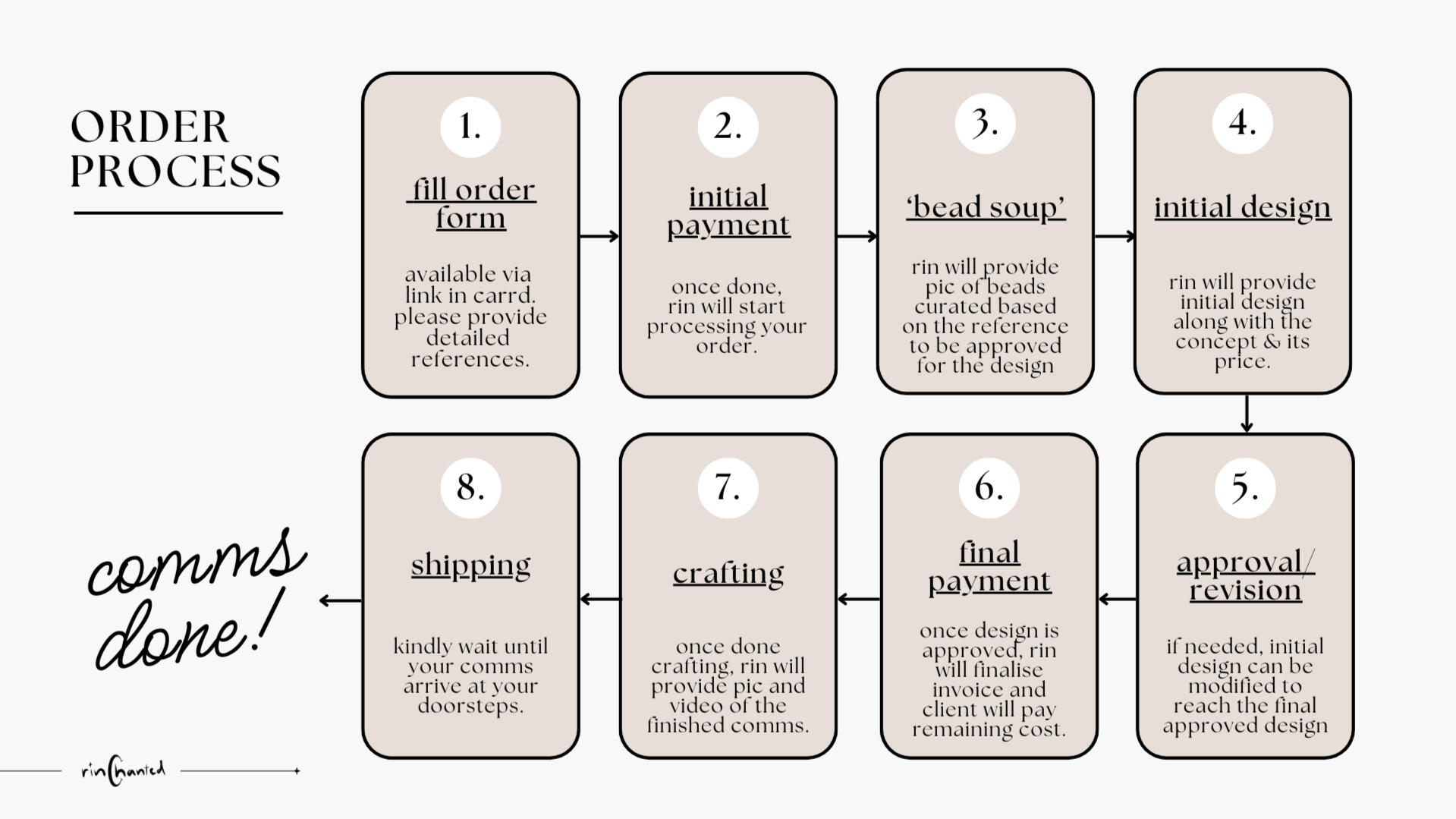 | ✦ base price fee (initial payment) is non-refundable. ✦ commissions will only be processed once initial payment has been made. a booking fee of IDR50k must be paid to be included in waiting list. ✦ turnaround time: 5-7 business days, depending on order queue and complexity of the commissioned accessory. ✦ Rin crafts your piece based on the submitted visual reference, notably taking inspiration from the colour palette and vibe. ✦ provide as much detail as possible in your reference if you wish for a specific style or design. Rin does not accept commissions to reproduce any work done by other artists. Rin reserves the right to reject your commission, should it proves to be beyond Rin's current capability. ✦ maximum of two (2) concept designs will be provided to choose from. each additional alternative design requested: + IDR10k. ✦ choose SURPRISE ME and i will design freely based on budget & ref submitted, no revisions and discussion. :-) ✦ no revision once design is confirmed and final invoice has been released. |